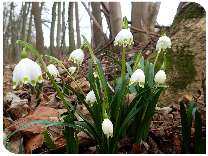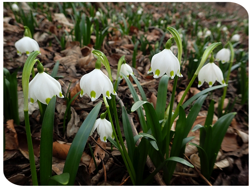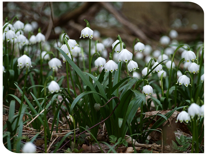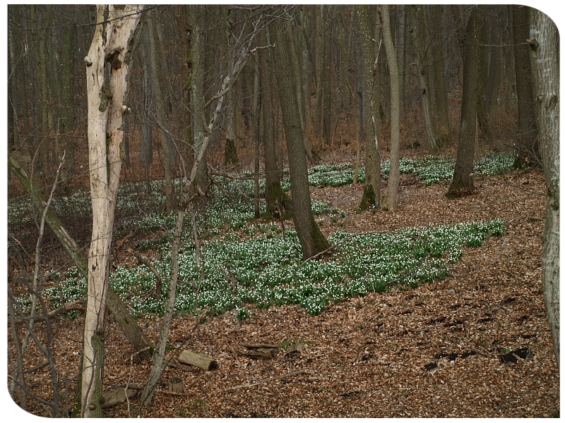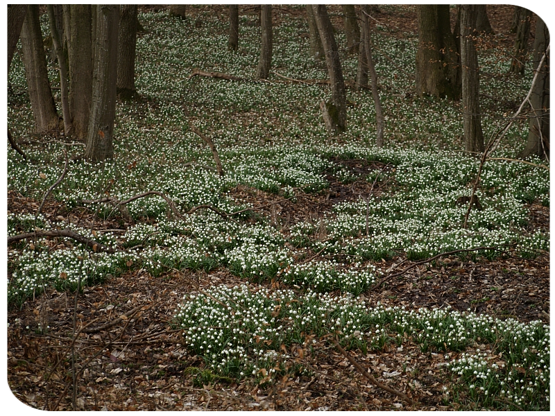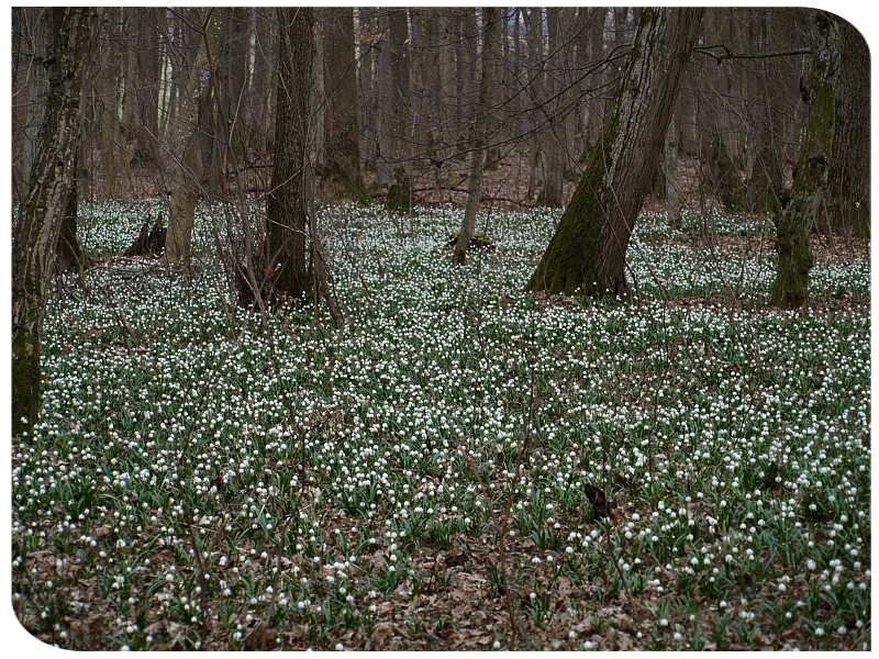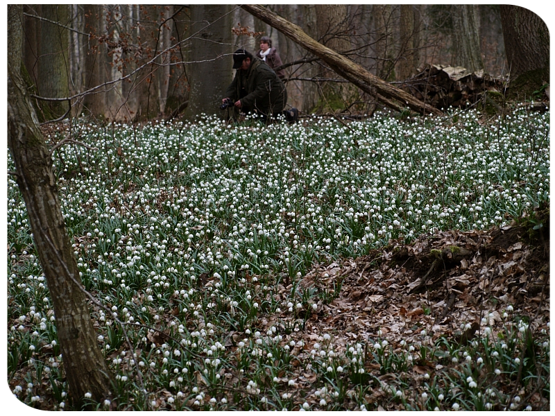 Der Märzenbecher (Leucoium vernum - leucon= weiß, und ion = Veilchen, weißes Veilchen; ver = Frühling) – wie er im Volksmund auch genannt wird – blüht je nach Witterung manchmal schon Anfang Februar bis in den April hinein. Seine weißen Blüten werden von Bienen bestäubt; beim Ausbleiben der Insekten findet eine Selbstbefruchtung statt. Er wird auch als „Großes Schneeglöckchen oder „Sommertürchen“ bezeichnet, unterscheidet sich vom Schneeglöckchen jedoch dadurch, dass er rundlicher und geschlossener ist, von der Spitze her einen gelblich grünen Fleck hat und vor allem dadurch, dass er duftet. Die Pflanze enthält ein giftiges Alkaloid und liebt den sickerfeuchten und morastigen Boden unter Laubgehölzen.Ausgeschilderte Rund- und Wanderwege sollten die Besucher nicht verlassen oder sich ihren Weg gar über „Trampelpfade“ durch die weiße Blütenpracht bahnen. Auf jeden Fall ist festes Schuhwerk angesagt, denn an manchen Stellen ist selbst der Weg stets ziemlich aufgeweicht. Benutzen Sie den ausgeschilderten Parkplatz und gehen Sie die paar 100 Meter bis zum Eingang zu Fuß!
